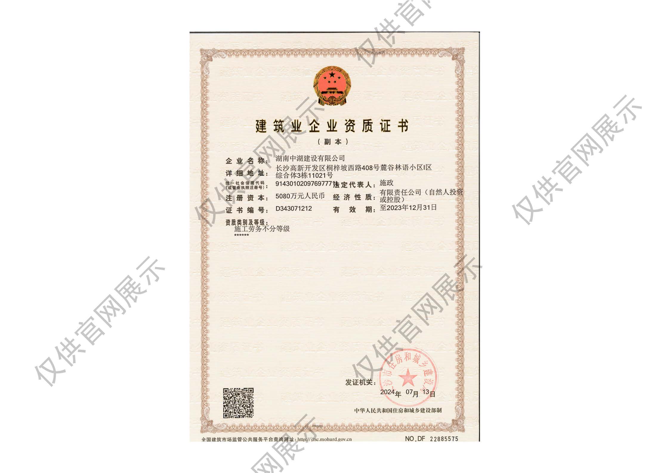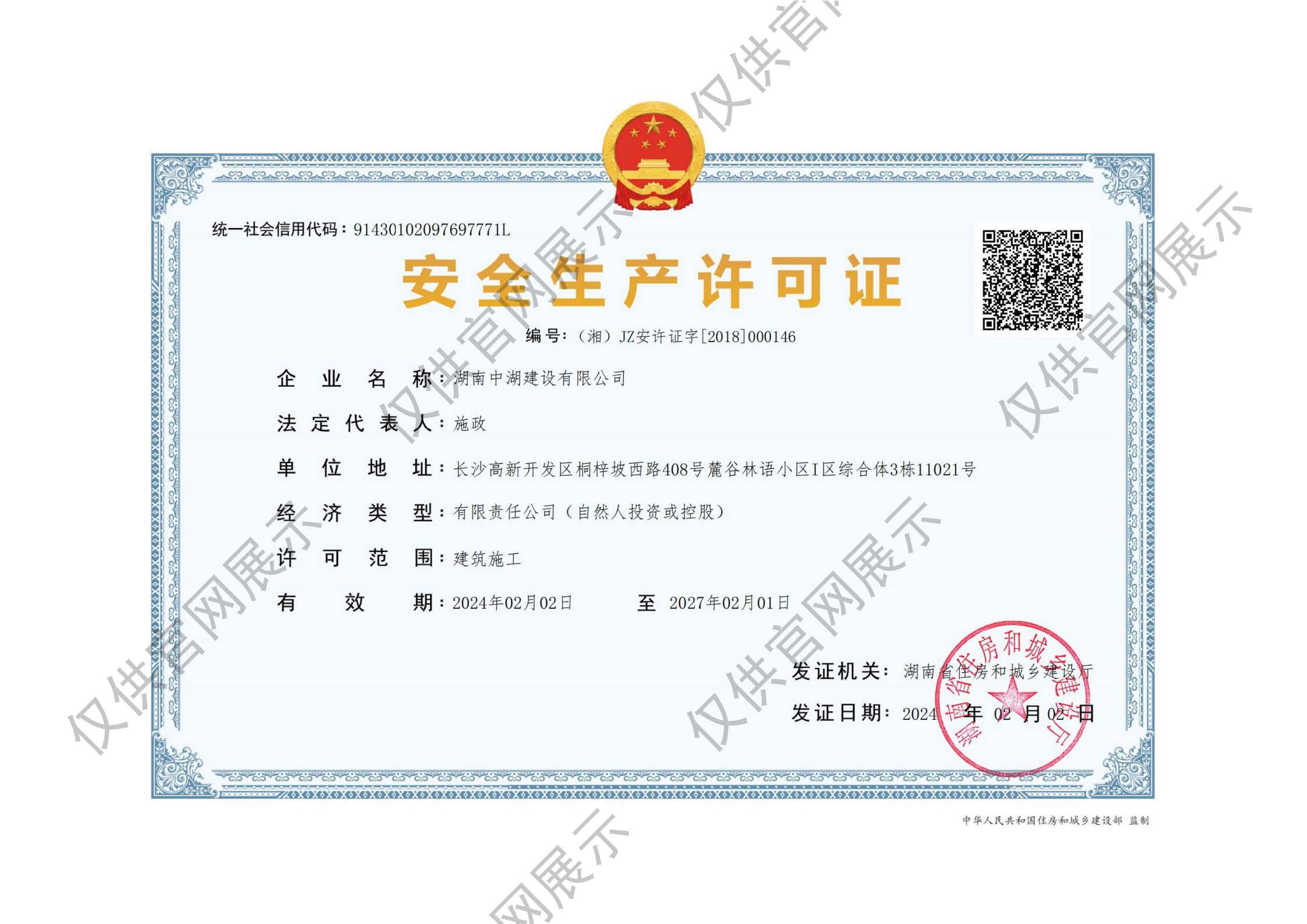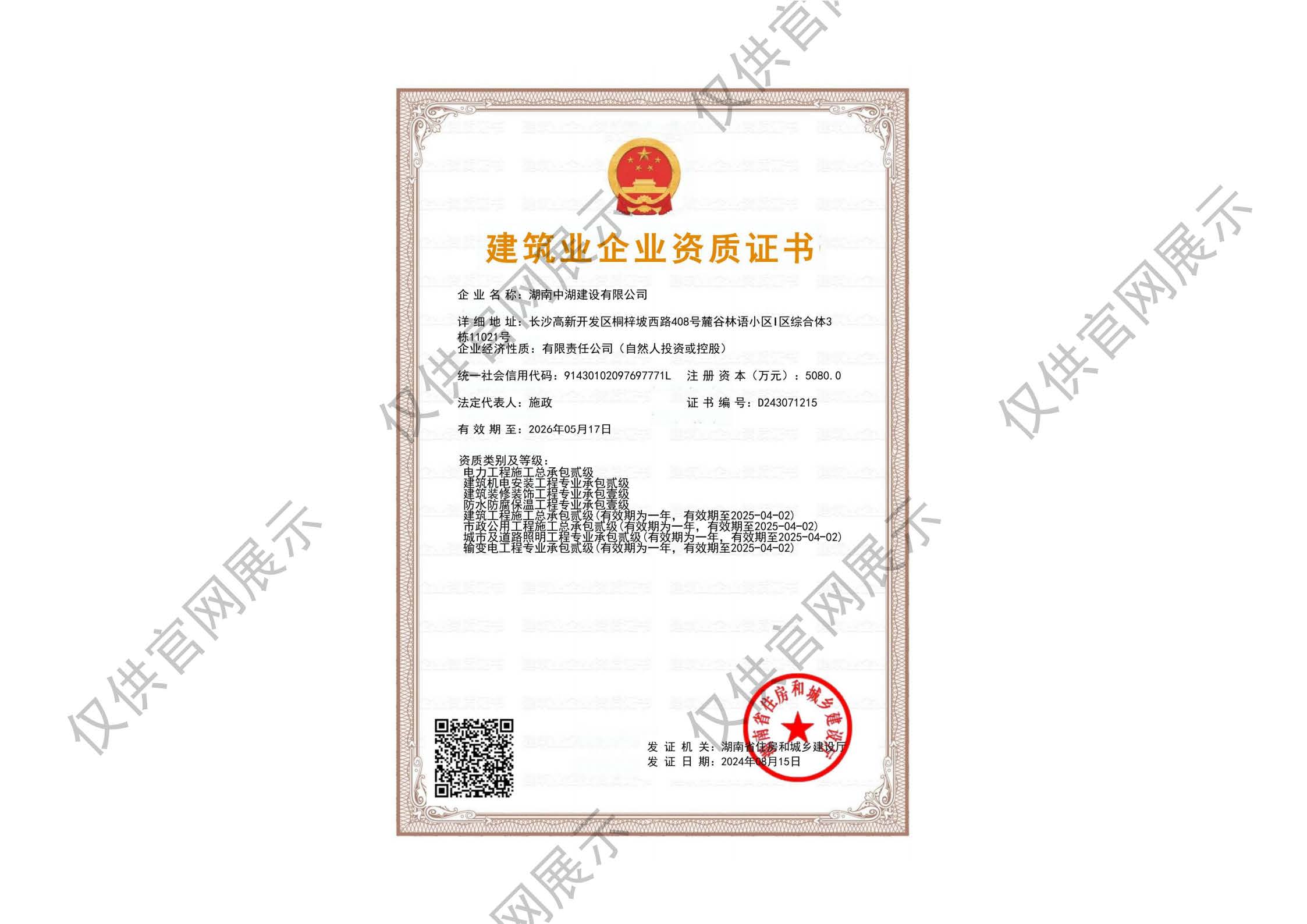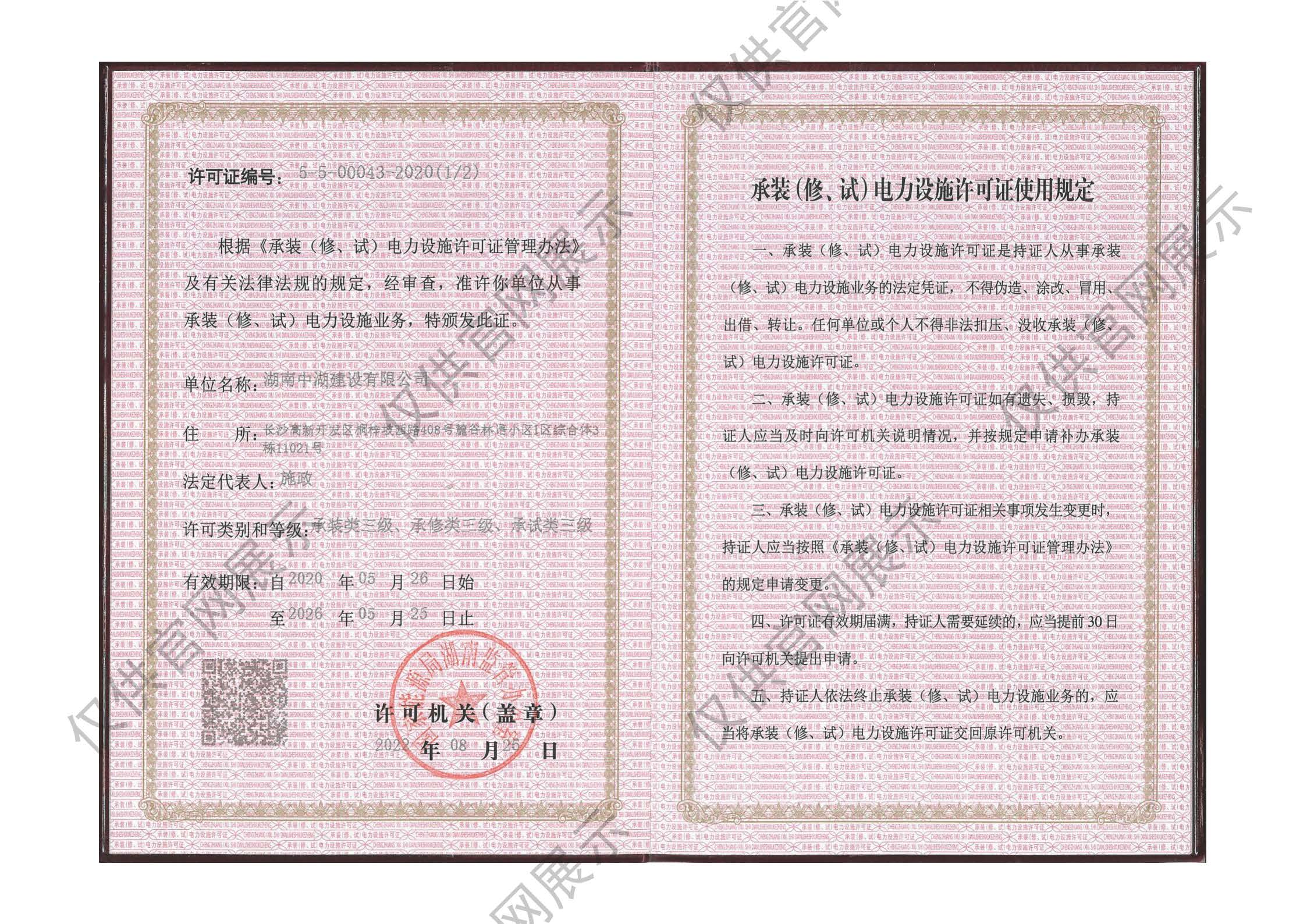 中湖建设承装(修、试)爱体育官方网站设施许可证三级