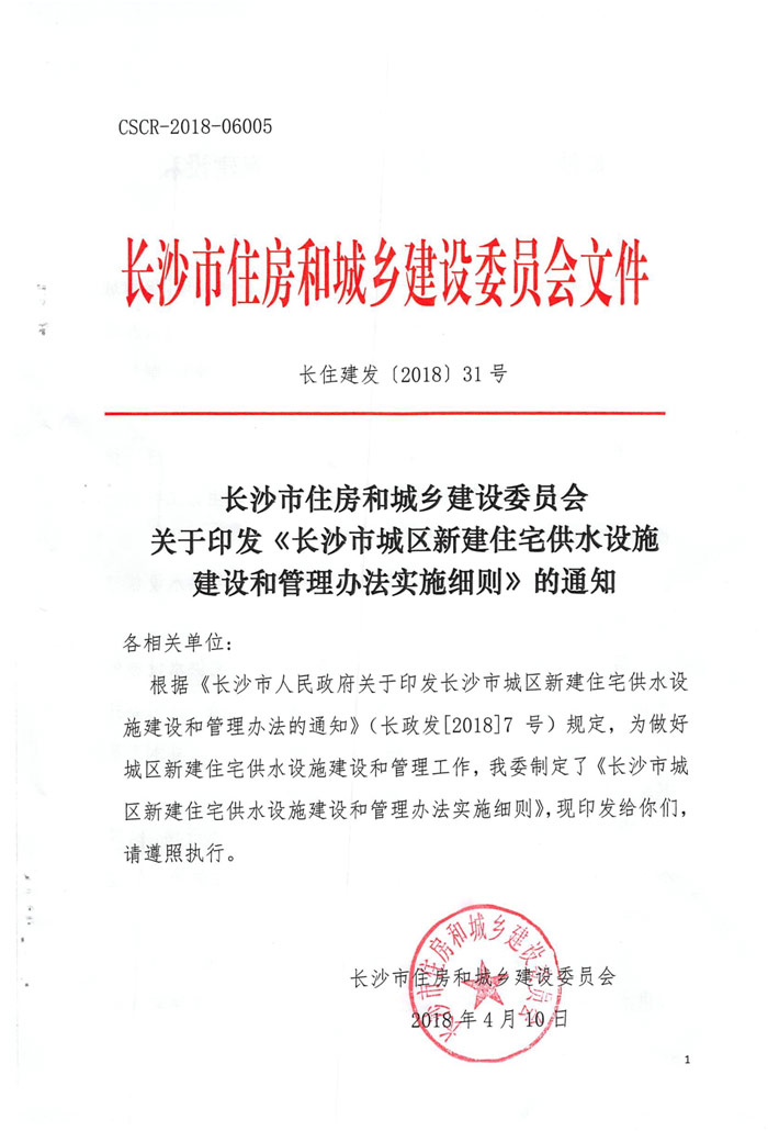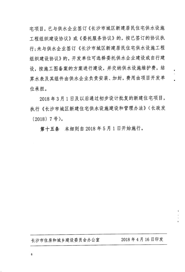 长沙市住房和城乡建设委员会 关于印发《长沙市城区新建住宅供水设施 建设和管理办法实施细则》的通知